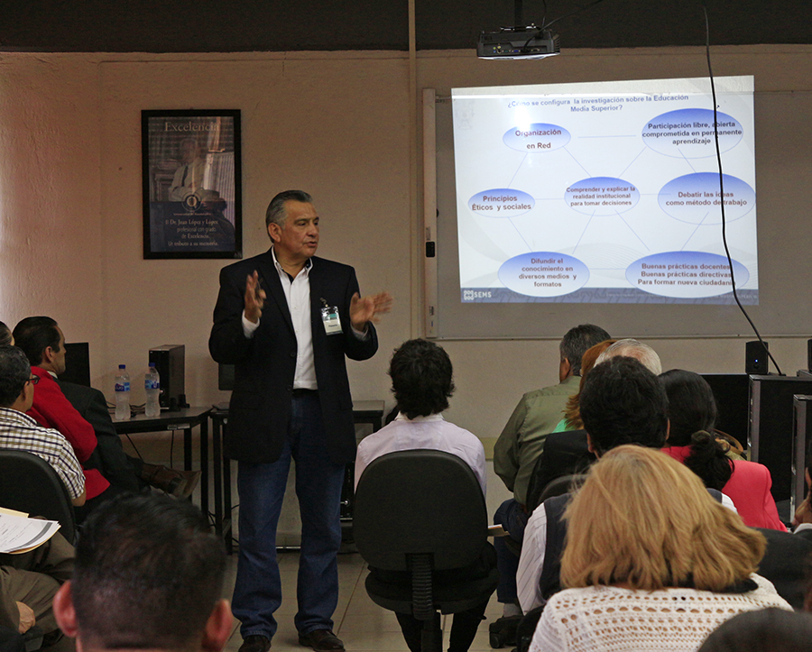 “Para el SEMS, el nuevo rol de los profesores no se reduce exclusivamente al aula, la tarea del docente tiene que ver con una práctica social más colegiada e incluyente donde acompañan a los alumnos para que su proceso de información sea más pertinente”, compartió el doctor Víctor Manuel Rosario Muñoz, director de Formación Docente e Investigación del SEMS.